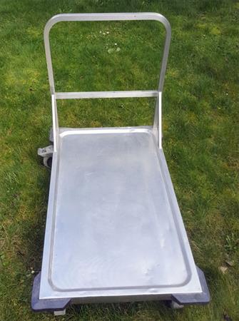 Chariot roulant en inox à plateau de 105 cm / 68 cm, hauteur 105 cm.