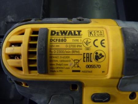 Visseuse-dévisseuse Marque : DeWalt Modèle : DCF 880 Tension : 18 V continu Etat : testé Remarque : pas d'accus Chargeur double Marque : DeWalt Modèle : DCB102 Boite de mèches Hitachi inclus