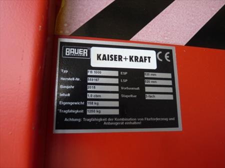 Bac à déchets vidangeable pour chariot élévateur : Marque : Kaiser Kraft Modèle : FB1000 Année : 2015 Poids : 158 kg Capacité : 1250 kg Dimensions d'encombrement : 123 cm x 103 cm x 115 cm Etat : Proche du neuf