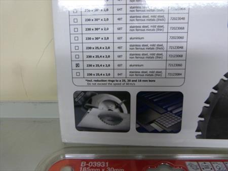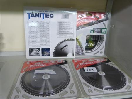 Lames de scie avec pastille carbure réaffûtable : Marque : Makita Tanitec Diamètre : 2X 18,5 cm, 1X 19 cm, 1X 23 cm Quantité : 4 Etat : Neuf