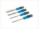 Lames de qualité professionnelle en acier trempé et revenu, tranchant biseauté. Poignées confortables en deux pièces avec lame intégrée sur toute la longueur pour prévenir le risque de casse. Tête de frappe en acier pouvant être tapée à l'aide d'un marteau ou d'un maillet. Tailles : 6, 13, 19 et 25 mm Fourni avec protège-lames.