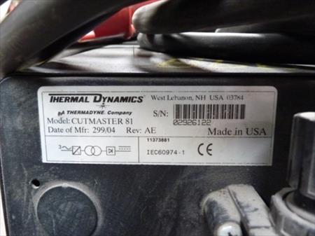 Découpeur plasma Marque : Thermal Dynamics Modèle : Cutmaster 81 N° de série : 02926122 Puissance : 60 A Tension : 400 Volt triphasé Dimensions d'encombrement : 90 cm x 50 cm x 80 cm Chariot de transport inclus