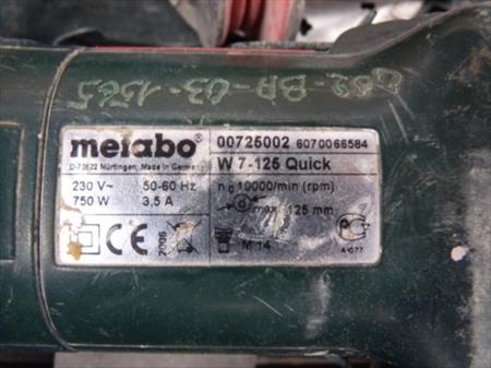 Meuleuse d'angles Marque : Metabo Modèle : W7125 Quick Tension : 230 V monophasé Puissance : 750 W Etat : testé Fourni avec plusieurs disques à meuler Visseuse-dévisseuse Marque : Metabo Modèle : BSP15.6+ Tension : 15.6 V Etat : testé Fourni avec 2 batteries de 15.6 V 2.4 Ah et son chargeur