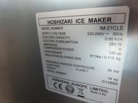 Machine à glaçons Marque : Hoshizaki Modèle : IM-21CLE Tension : 230 V monophasé Dimensions : 250 W Etat : Bon