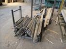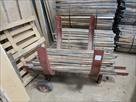 Chariots métalliques Dimensions d'encombrement : 1X 200 cm x 93 cm x 113 cm 1X 50 cm x 91 cm x 95 cm Quantité : 2 Remarque : Les pneus d'un chariot sont plats . Contenu non inclus Berceau pour bois en métal Dimensions d'encombrement : 147 cm x 230 cm x 120 cm Remarque : Contenu non inclus Etat : Oxydé