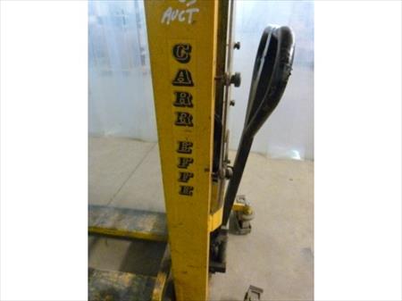 Gerbeur manuel Marque : Carr Effe Longueur de fourches : 113 cm Hauteur de levée maximum : 101 cm Dimensions d'encombrement : 65 cm x 165 cm x 135 cm Etat : testé et en état de fonctionnement