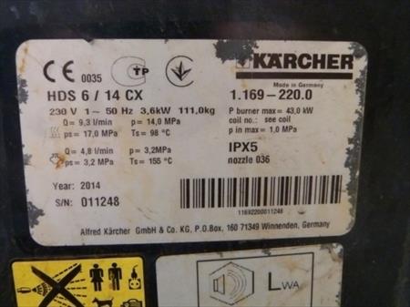 Nettoyeur haute pression Marque : Karcher Modèle : HDS 6/14 CX Année : 2014 Tension : 220 V monophasé Puissance : 3,6 kW Dimensions d'encombrement : 65 cm x 130 cm x 95 cm Etat : testé et en état de fonctionnement