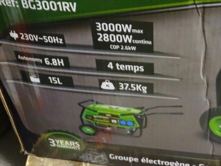 Générateur max. 3000W + roues Marque : Build worker Puissance max : 3000W Puissance en continu : 2800W Réservoir essence métallique 15L Autonomie max 6.8H 2 prises Equipé de roues et d'une poignée de transport