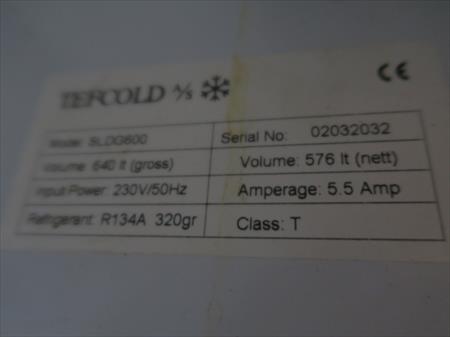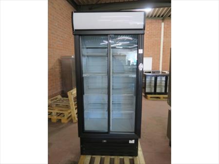 Réfrigérateur à portes en verre coulissantes Marque : Tefcold Modèle : SLDG600 Tension : 230 V monophasé Capacité : 576 L Réfrigérant : R134A Nombre de grilles : 8 Dimensions : 90 cm x 63 cm x 200 cm Etat : non testé et utilisé, mais serait en état de fonctionnement Remarque : pas de clé