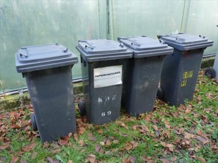 Poubelles en plastique sur roulettes avec couvercle Marque : Weber Dimensions : 47 cm x 52 cm x 90 cm Quantité : 4