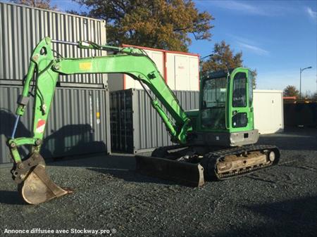 Pelle-midi Volvo ECR88 2010 d'occasion avec godet GP, attache rapide, lame, clapets anti-retour et système hydraulique auxiliaire.