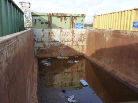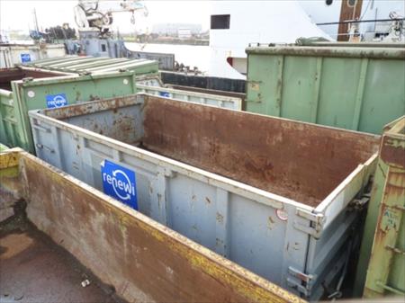Container de chantier Marque : ANG Volume : 14,5 m³ Dimensions intérieurs : 4,85 m x 2,30 m x 1,30 m Type de portes arrières : ouvrantes Poids : 1930 kg Etat : bon, corrosion sur le plancher Réf : A