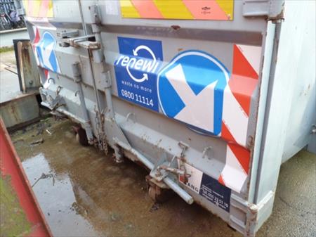Container de chantier Marque : ANG Volume : 9,7 m³ Dimensions intérieurs : 4,85 m x 2 m x 1 m Type de portes arrières : ouvrantes Poids : 1670 kg Etat : bon, corrosion sur le plancher Réf : 05813