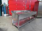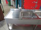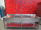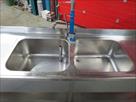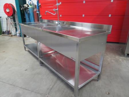 Grande plonge inox 2 cuves 2 égouttoirs + robinet préfloche. Dimensions: 240x70x89/Cm (LxPxH) Dimensions cuves: 60x50x30/Cm (LxPxH)