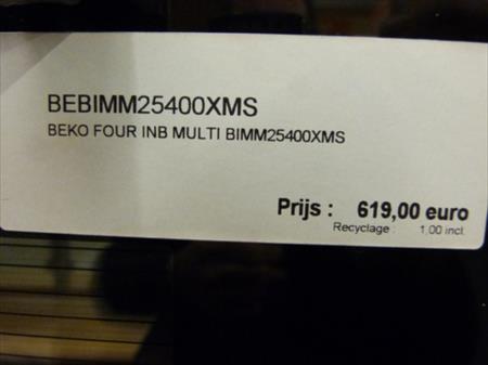 Four encastrable Marque : Beko Modèle : BIMM 25400 XMS Tension : 220 V monophasé Puissance : 3,1 kW Dimensions : 59 cm x 57 cm x 58,5 cm Classe énergétique : A Capacité : 71 L Etat : neuf Prix magasin : 619,00 eur