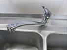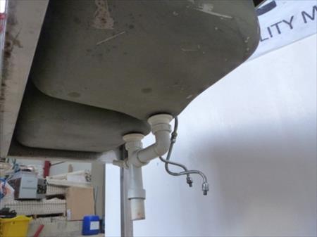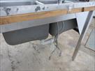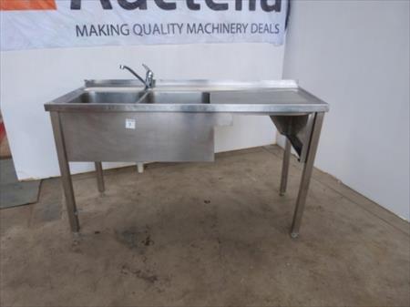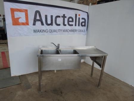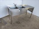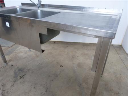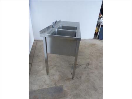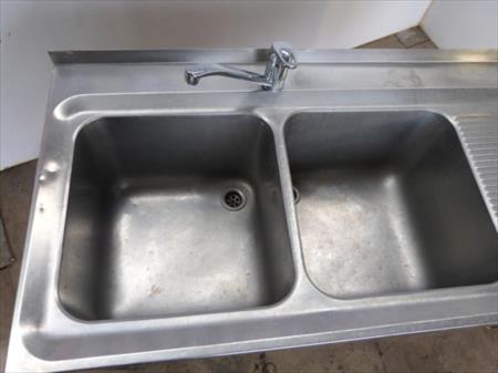 Evier double bacs inox Munis d'un mitigeur, dépourvu de bouchons Dimensions d'un bac : 40 cm x 40 cm x 30 cm Dimensions : 150 cm x 60 cm x 90 cm Etat : bon Remarque : La face avant en dessous de l'égouttoir est découpée