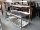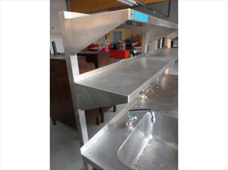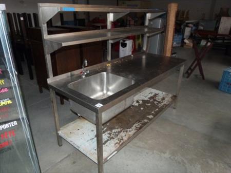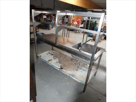 Table en inox avec évier et étagère inox Dimensions : 190 cm x 78 cm x 167 cm Dimensions du bac évier : 60 cm x 50 cm x 30 cm Mitigeur inclus État général : usagé
