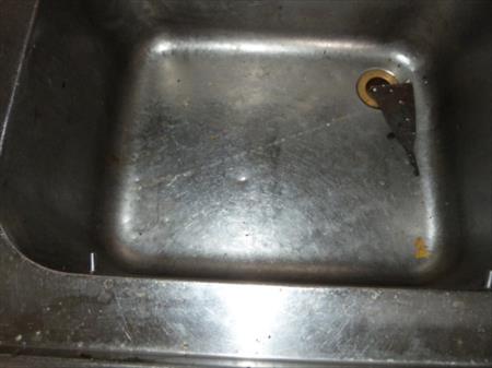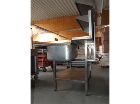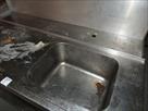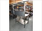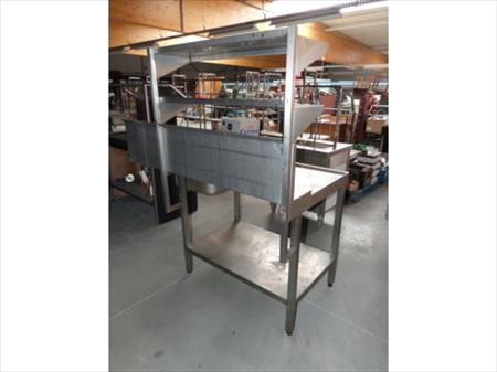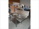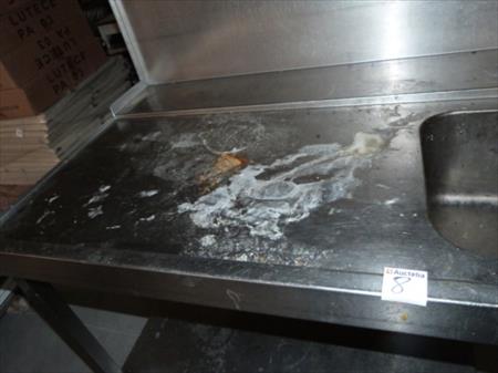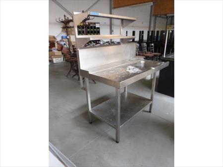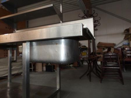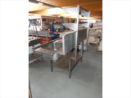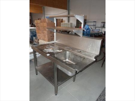 Table en inox avec bac évier Dimensions : 150 cm x 85 cm x 145 cm Nombre d'étages : 2 Dimensions du bac évier : 50 cm x 40 cm x 25 cm État : à nettoyer