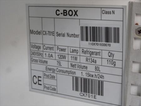 Frigo Vertical Marque : c-box Modèle cX-701E Tension 240 V monophasé Puissance : 120 W Capacité 80 l Classe énergétique N Dimension 46 cm X 49 cm X 100 cm État non testé