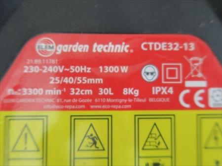 Tondeuse électrique Marque : Elem Modèle : CTDE32-13 Année : 2016 Tension : 230 V monophasé Puissance : 1300 W Hauteur de coupe : 25 mm, 40 mm, 55 mm Longueur de la lame : 32 cm Capacité du bac : 30 L Poids : 8 kg Dimensions d'encombrement : 92 cm x 40 cm x 67 cm Etat : non testé Ancienne référence : 1141-058