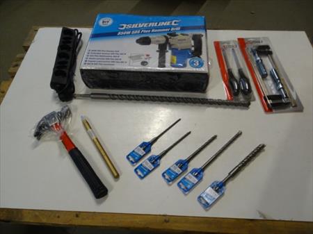 Fourni avec mandrin à clé de 13 mm, clé à mandrin, mandrin SDS Plus avec vis de blocage, 3 forêts à maçonnerie SDS Plus de 6, 8 et 10 mm, burin plat, burin pointu, butée de profondeur, clé à ergots, protection anti-poussières et pot de graisse.