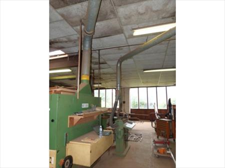 Aspiration 3 sacs Dimensions : 316 cm x 73 cm x 137 cm (partie sous manches filtrantes) Hauteur totale : 370 cm Diamètre des sacs récolteurs : 60 cm Tension : 220 V triphasé Pas de plaquette visible Tuyauterie Les tuyaux vont de l'aspiration à la calibreuse, à la ponceuse de chant et vers la scie radiale, la scie double Démontage à charge de l'acquéreur