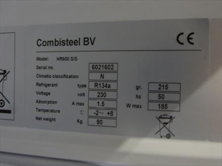 Réfrigérateur Marque : Combi-Steel Modèle : HR600S/S Tension : 220 V monophasé Puissance : 185 W Classe climatique : N Gaz réfrigérant : R134a Quantité de gaz : 215 g Poids : 90 kg Dimensions : 77 cm x 73 cm x 190 cm Etat : n'a pas démarré