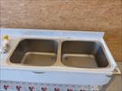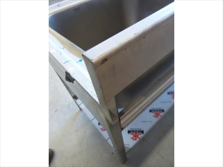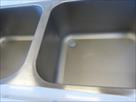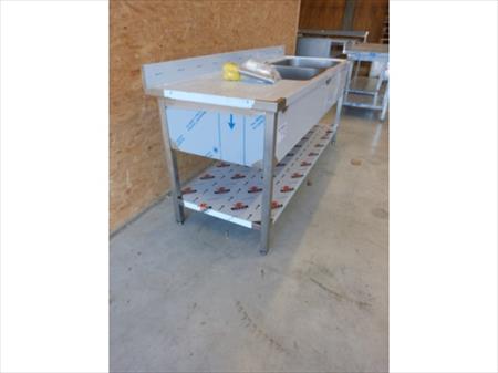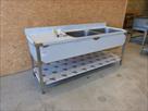 Plonge double bac inox Tablette inférieure Egouttoir à gauche Dimensions : 200 cm x 70 cm x 94 cm Hauteur plan de travail : 85 cm Dimensions des bacs : 60 cm x 50 cm x 32 cm Etat : matériel neuf Fourni avec ce lot : bonde et crépine