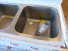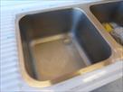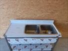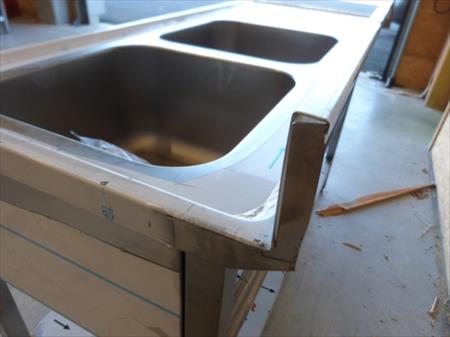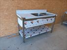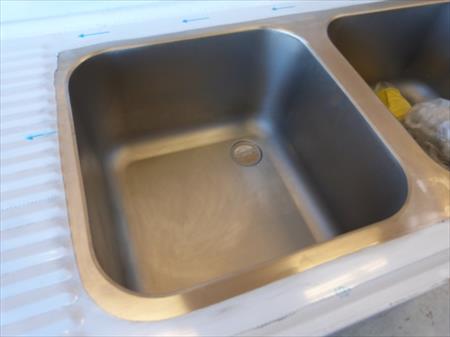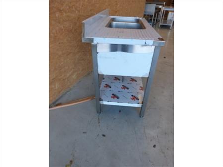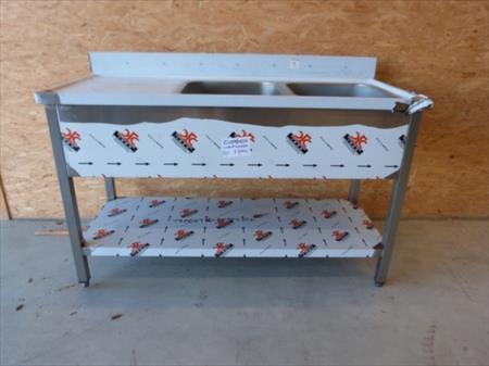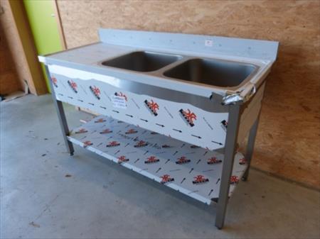 Plonge double bac inox Tablette inférieure Egouttoir à gauche Dimensions : 140 cm x 60 cm x 94 cm Hauteur plan de travail : 85 cm Dimensions des bacs : 40 cm x 40 cm x 25 cm Etat : matériel neuf, extrémités dosseret légèrement pliées Fourni avec ce lot : bonde et crépine
