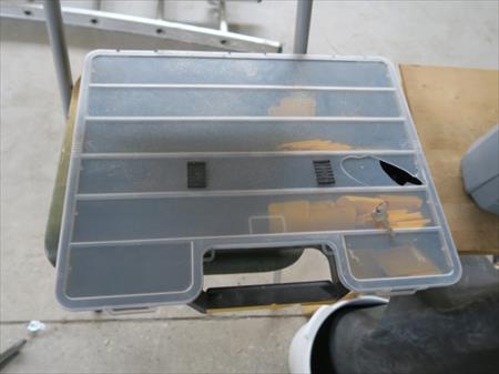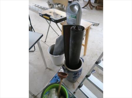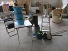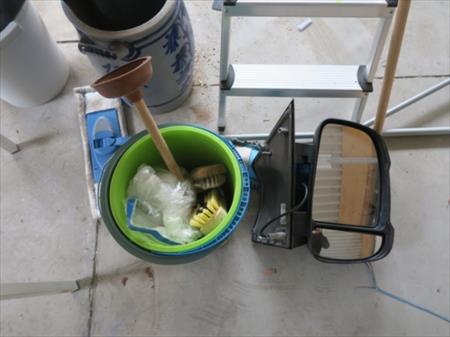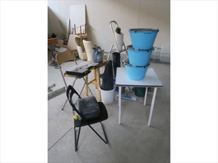 Escabelle, divers pots, table, seaux, tabouret
