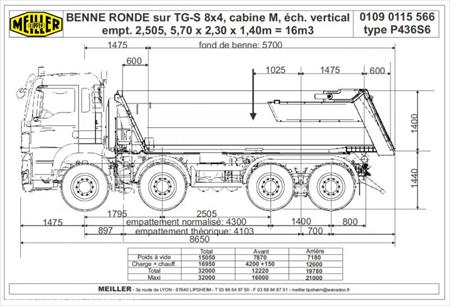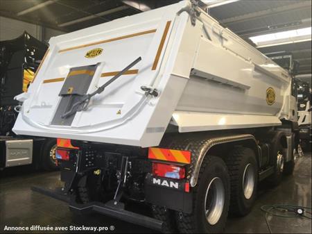 DISPONIBLE SUR PARC Cabine mi-longue M - Moteur D2676LF53 - 420 ch/309 kW EURO6 - 12,4 litres - échappement vertical - ressorts AR paraboliques 13 t - Pont AR à réducteurs - Blocage de différentiel - - Ressorts AV paraboliques 8,0 t version mi-haute - Pneus 13R22,5 - sans roue de secours - Réservoir à carburant de 300 l à droite et 40l d'AdBlue - MAN BrakeMatic (système freinage électronique) Système MAN Easy Start antirecul ABS - Freins à disque pour essieu avant et Frein à tambour pour pont AR - Frein de finisseur - Frein de direction - Climatiseur - 2 gyrophares - Avertisseur acoustique pour marche arrière engagée désactivable - Radio MAN MediaTruck Advanced12 V avec écran couleur 7 pouces et SD de navigation EUROPE INTEGRALE - Fonctionnalité mains libres pour deux téléphones Bluetooth - MAN CameraView- caméra espace arrière - Crochet Pneumatique MG BENNE RONDE MEILLER 5,50 x 2,30 x 1,40 m (15,68 m3 en eau) Fond 8mm Ridelles 6mm Face avant Porte arrière 5 mm Basculement par vérin télescopique simple effet MEILLER. Fin de course par butée mécanique coupant lalimentation. - Angle de bennage : 50° - Compas stabilisateur sous caisse. Barre Anti-Encastrement MEILLER à fonctionnement hydraulique, à double commande (en cabine + extérieure), - Porte arrière hydraulique double effet BACHE ELECTRIQUE