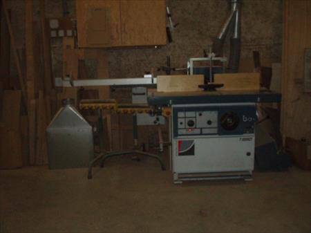 Toupie avec chariot à tenonner toupie arbre de 50 mm avec chariot à tenonner 3 guides en plus: Longueur : 120 cm, largeur : 70 cm, hauteur : 86 cm Marque : Paoloni Modèle : T1200 ct