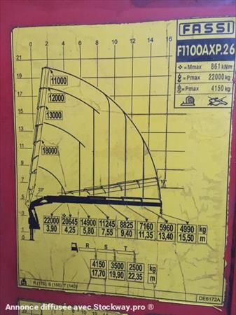 Marque Scania 8x4 tracteur Type r500 Date De 1ere Mise En Circulation 27/05/2007 Kilométrage 430000 Essieu Essieu Directeur 2 Nombre D'essieux Moteurs./2 Nombre D'essieux 4 Suspension air intégrale Grue Constructeurs fassi Type De 110tm année 2008 Maximum longueur 28m Maximum poids 22tm À Distance radiocommande stabilisateur 4 Position Derrière La Cabine extension hydraulique 11 Crochet poids a vide 253000kg Poids Brut Combiné ptac 32000 ptra 40 r433-1 90t Empattement 410 Capacité De Carburant 330 litres Condition Des Pneu60 /60 /60/60 Taille De Pneu (Avant)385/65R22, 5 Taille De Pneu (Arrière)315/80R22.5 Motorisation Marque Du Moteur_Scania Puissance 500 Boîte De Vitesses Boîte de vitesse manuelle Transmission De La _Scania Nombre De Vitesses 16 Euro Standard 4 Blocage De Différentiel Régulateur De Vitesse Cabine Type De Cabine couchettes Pare-Soleil Climatisation