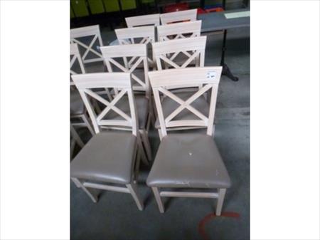 Chaises en bois Quantité : 8 Tissus en simili Dimensions : 46,5 cm x 38 cm x 89,5 cm Etat : usagé Remarque : certaines assises sont abimées