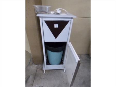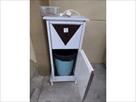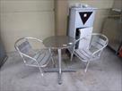 Table et chaises d'extérieur Diamètre de la table : 60 cm Hauteur de la table : 70 cm Quantité de chaises : 2 Etat : bon Remarque : il manque une vis réglable pour la hauteur sous l'un des pieds Un meuble poubelle en bois inclus