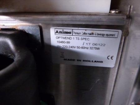Machine à café Marque : Animo Modèle : Optivend 1 TS SPEC Tension : 230 V monophasé Puissance : 3275 W Dimensions : 38.5 cm x 50 cm x 69 cm Etat : testé Pas de clés, tel que sur photos