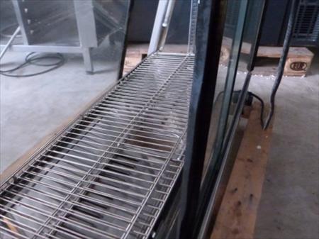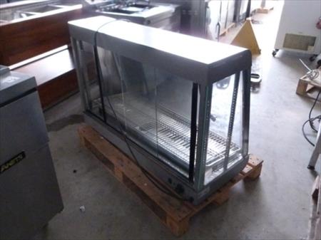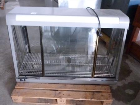 Armoire chauffante vitrée Marque : Bartscher Modèle : R60-3 Tension : 230 V monophasé Puissance : 2200 W Température de chauffe : 110 °C Dimensions : 120 cm x 50 cm x 79 cm Etat : non testé Remarque : une seule attache pour grille inclue, coups dans la partie supérieure