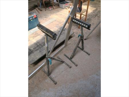 Servantes à rouleaux Marque : Worlcraft Quantité : 2 Largeur de rouleaux : 30 cm Etat : bon Equerre en aluminium Dimensions : 105 cm x 156 cm Etat : proche du neuf Plateau à roulettes Dimensions : 125 cm x 60 cm x 17 cm Etat : bon