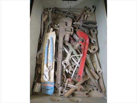 Bloc tiroir en métal Marque : Art Métal Dimensions totales : 45 cm x 62 cm x 132 cm Etat : bon Clés plates, mixtes, clés anglaises, Lot tel que sur photos