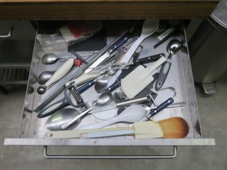 Etabli en inox avec tablette en bambou Nombre de tiroirs : 2 Dimensions totales : 120 cm x 64 cm x 92 cm Etat : à nettoyer Ustensiles de cuisine Spatules, éplucheurs, couverts, Lot tel que sur photos