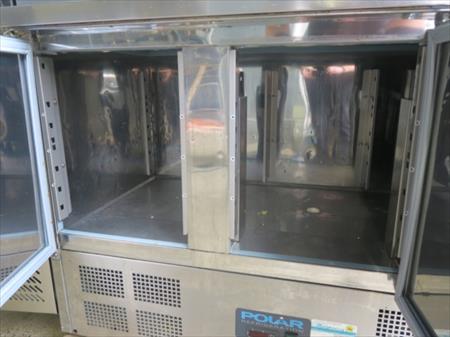 Meuble réfrigéré Marque : Polar Modèle : G605-5 Tension : 230 V monophasé Puissance : 230 W Nombre de portes : 3 Type de gaz réfrigérant : R134A Quantité de gaz : 260 Gr Dimensions totales : 137 cm x 70 cm x 100 cm Etat : testé, semble fonctionner