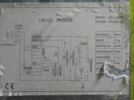 Réfrigérateur Modèle : GN 650 BT Tension : 230 V monophasé Puissance : 650 W Gaz réfrigérant : R404A Quantité de gaz : 550 Gr Dimensions totales : 75 cm x 83 cm x 202 cm Etat : testé, semble fonctionner