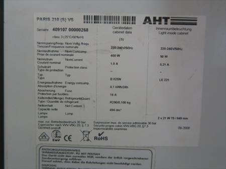 Congélateur bahut Marque : AHT Modèle : Paris 210 VS Année : 2008 Tension : 230 V monophasé Puissance : 400 W Gaz réfrigérant : R290 Quantité : 100 g Dimensions : 210 cm x 86 cm x 84 cm Etat : à reconditionner