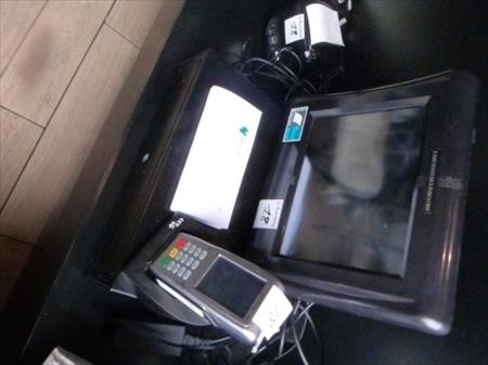 Caisse enregistreuse tactile, imprimante de tickets, mode de payement Verifone, solde de rouleaux de papier Lot tel que sur photos Etat : non testé, la serrure du tiroir caisse est manquante