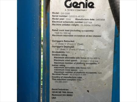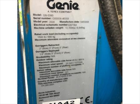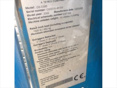 Nacelle ciseau Diesel Marque : Genie Modèle : GS 5390 N° de série : GS9008-46359 4 X 4 - Hauteur de travail : 17,95 m Charge maximale d'utilisation : 680 kg Année : 2008 Heures : 2128 heures Poids : 8845 kg Etat : bon, machine toujours suivie par l'ancien propriétaire REF : NA42
