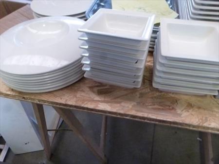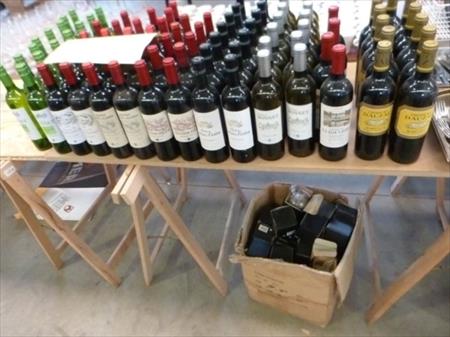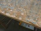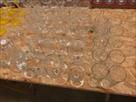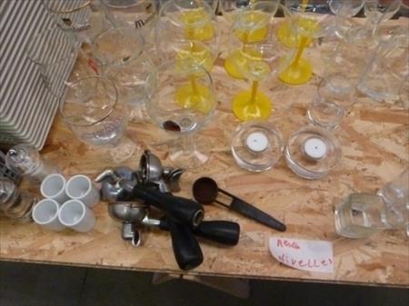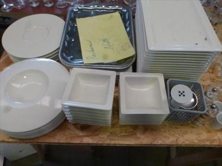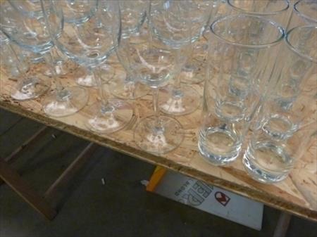 Verres divers, bouteilles de vin vide pour décoration, assiettes, etc.