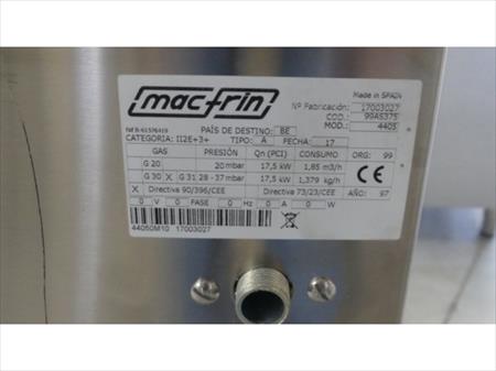Plancha au gaz Marque : Mac frin Modèle : 4405 Puissance : 17,5 kW Année : 1997 Type de gaz : G30 Dimensions de la plaque : 100 cm x 42 cm x 4,5 cm Dimensions totales : 100 cm x 50 cm x 97 cm Etat : non testé Remarque : elèvement à charge de l'acquéreur