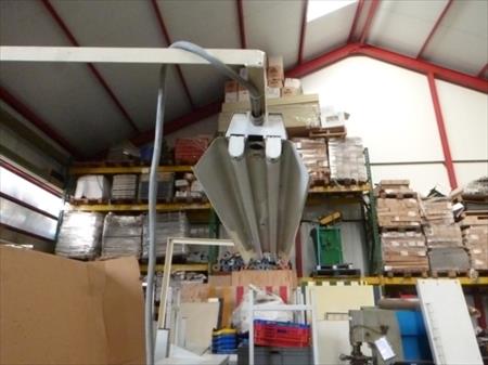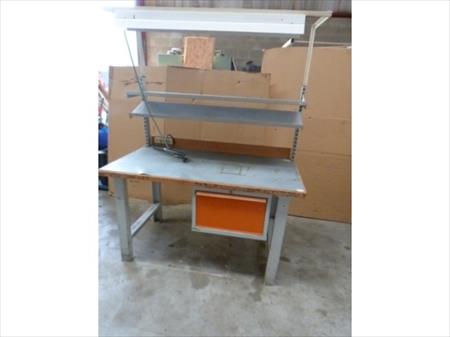 Table de travail avec tiroir et étagère frontale et éclairage Dimensions totales : 152 cm x 85 cm x 200 cm Hauteur du plan de travail : 85 cm Etat : utilisé