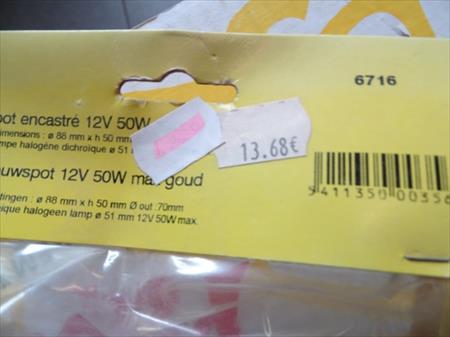 17 spots encastrés 12 V 50 W (5 modèles) Dimensions : Diam. 88 mm x h 50 mm diam.cut 70 mm et Diam. 75 mm x h 50 mm diam.cut 60 mm Prix magasin : 155