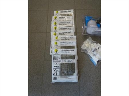 1 PISTOLET DE PEINTURE, 8 BÂCHES DE PROTECTION PROF. 4 X 5 M, 1 PAIRE DE GANTS